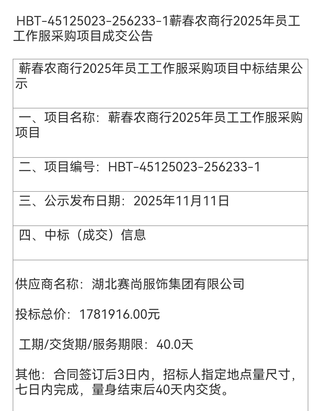 11月11日,湖北黄冈蕲春县农商行发布的一则工作服采购中标公告引发关注。公告显示,蕲春农商行花了178.2万元为489名员工购买工作服。